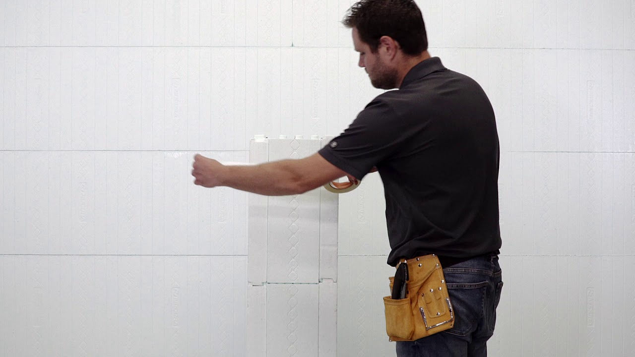 Fiber Tape is used to provide additional EPS support for field cut forms that have more than 4" (100mm) of EPS extending past the last web, brick ledge forms in the corner conditions, and radius panel.